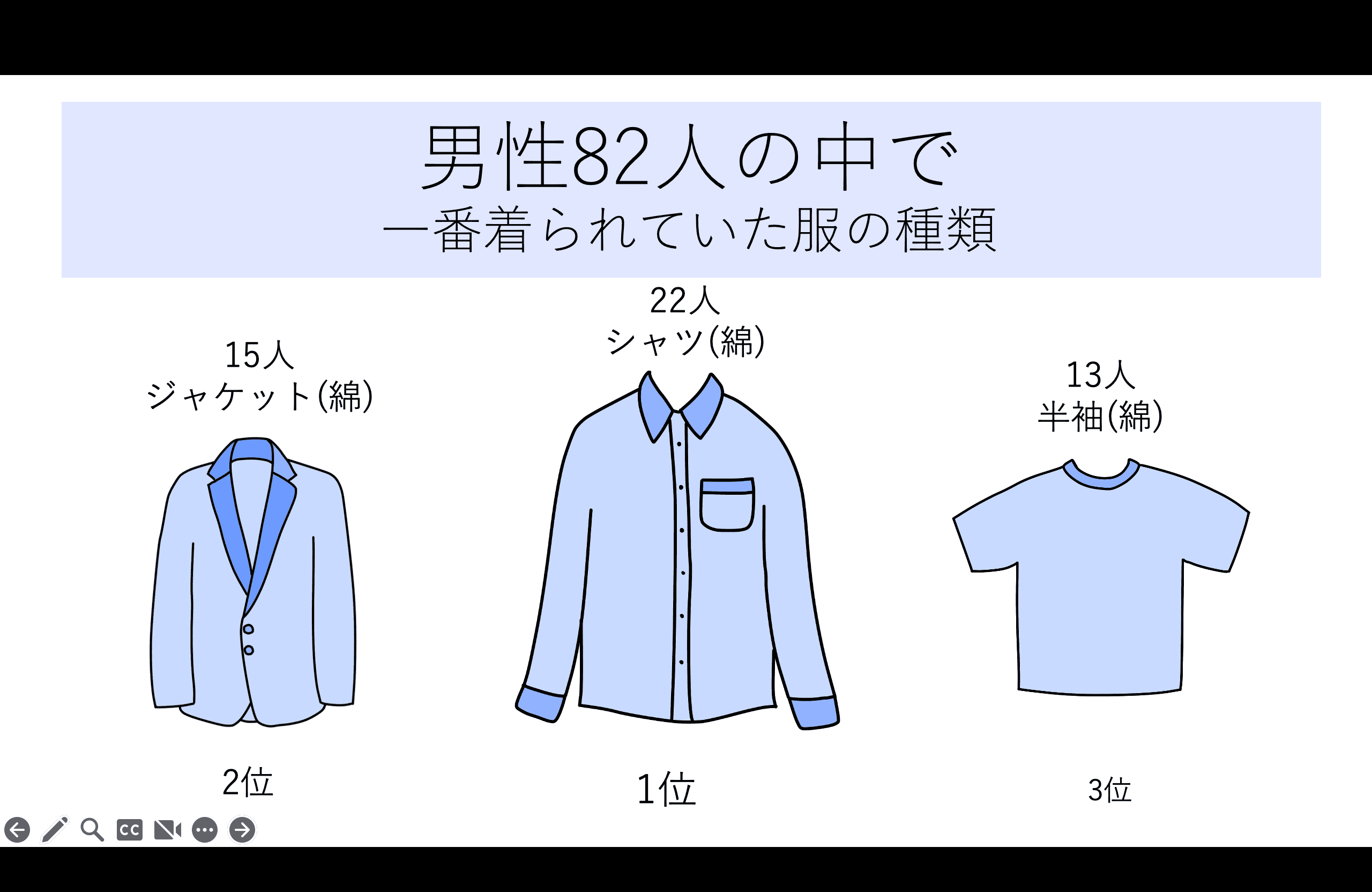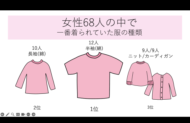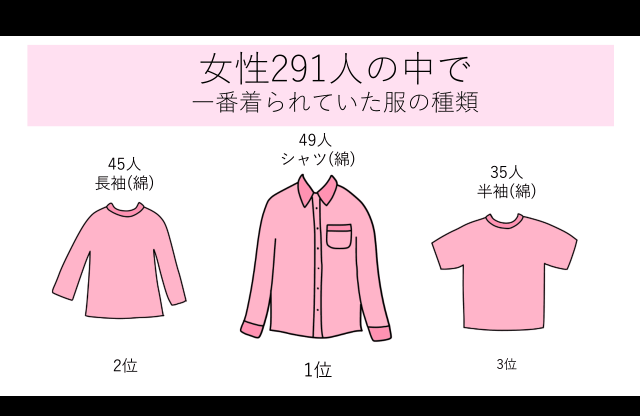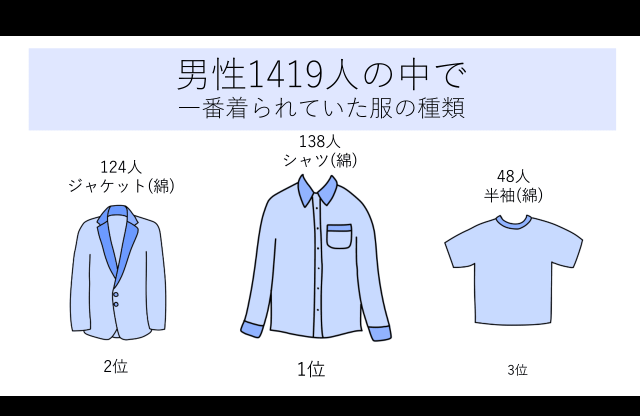 調査を行った日の気温が例日に比べ少し高かったこともあり、半袖(綿)が次いで多かったと考えられる。