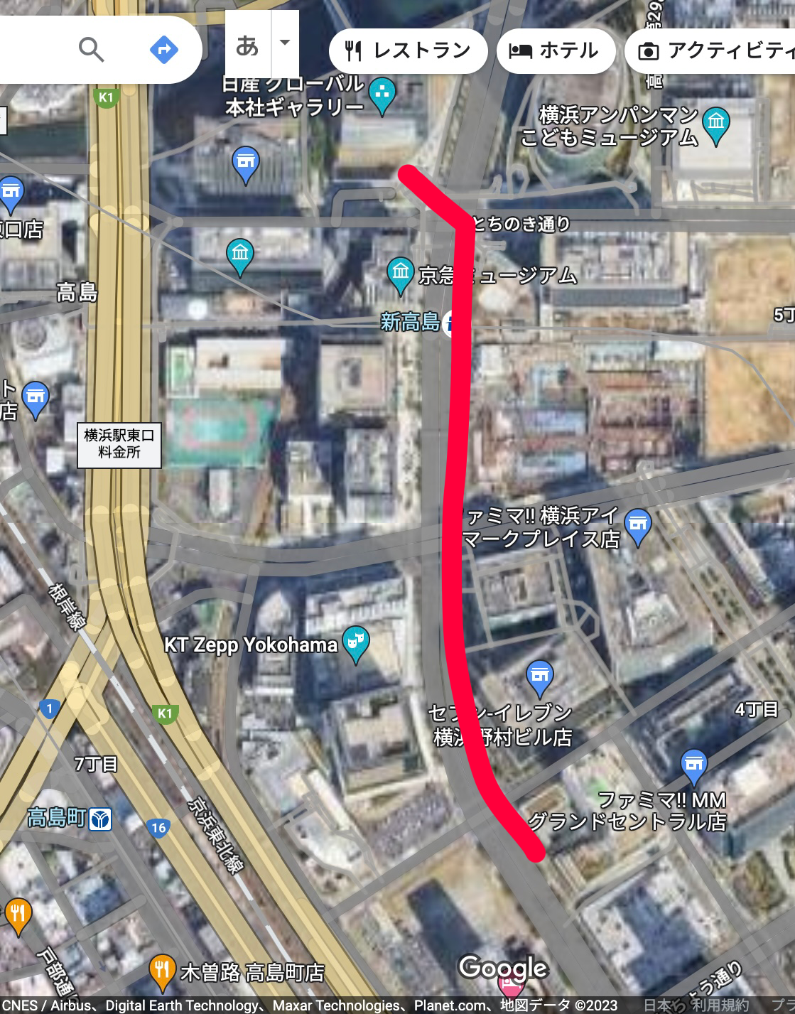 東側の通路を通って、歩道橋下の横断歩道を曲がる。