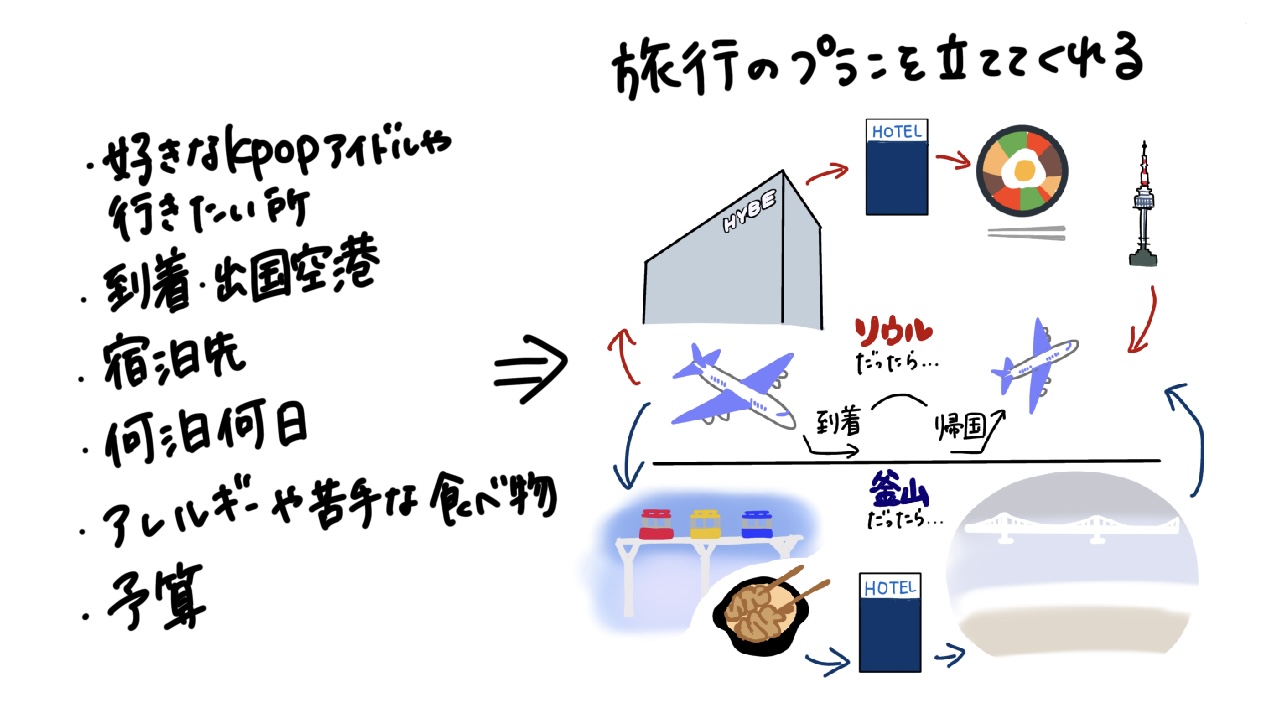 ・好きなK-Popアイドルや行きたいところや食べたいもの、到着する空港、搭乗する空港、宿泊先、何泊滞在、予算、