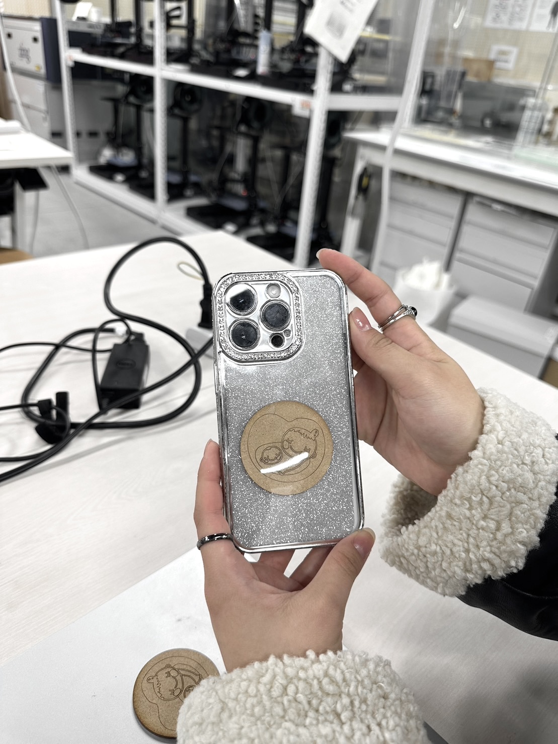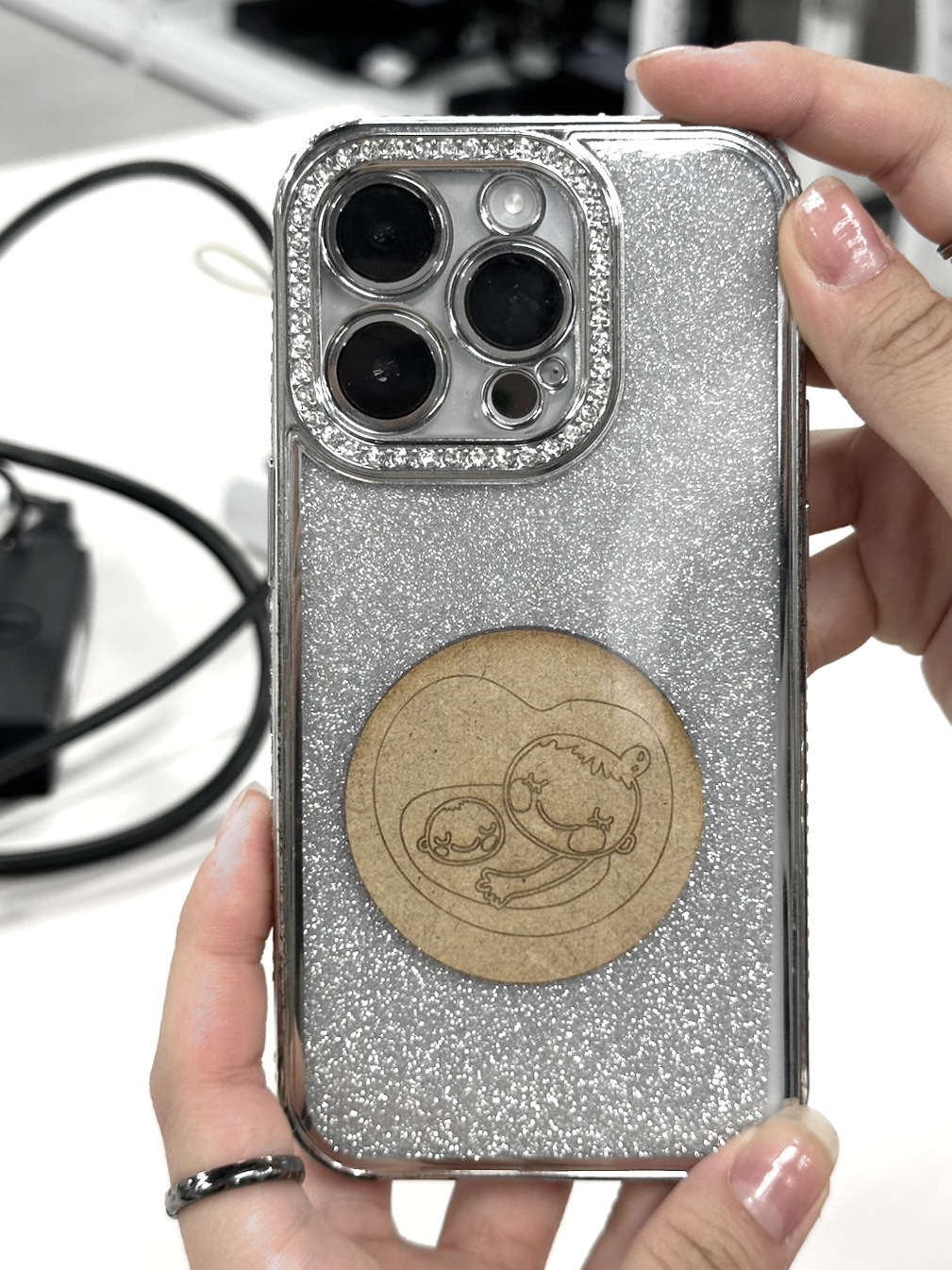 作る上でマタニティーマークは板をレーザーカッターで加工して作成し、100均などに売っているクリアスマホケースに作成したマタニティーマークと